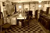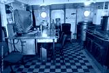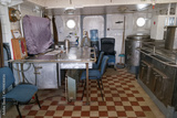 Interior of a ship's kitchen with seating area, stainless steel counters, and cooking equipment during daytime