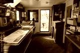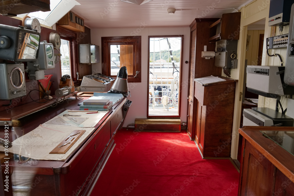 Captain's cabin filled with navigation tools and a view of the dock during daytime
