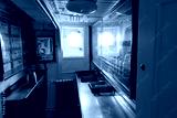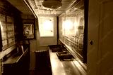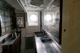 Kitchen area of a vintage ship featuring clean surfaces and round porthole windows with natural light streaming in