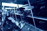 Ropes and equipment stored inside a boat's cabin with organized shelves and dim lighting