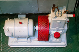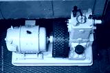 Electric motor and pump system seen inside an industrial facility during daylight hours