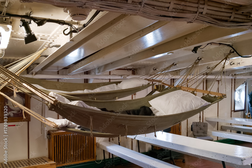 Hammocks suspended in a ship's cabin create a cozy sleeping area for crew members during a voyage