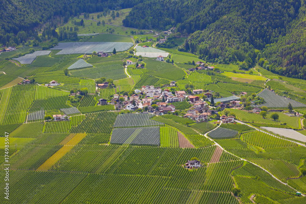 Südtirol- Panorama, Apfelplantagen im Vinschgau mit Blick auf Morter