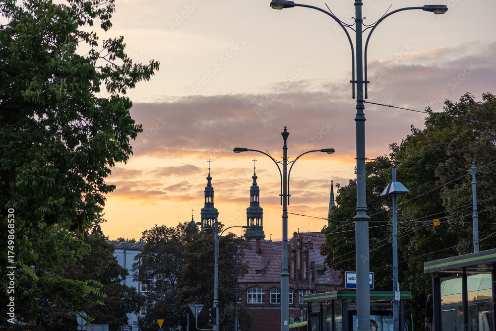 Historic European city streetscape with church spires and traditional buildings framed by trees and streetlights under a golden sunset sky, showcasing urban beauty