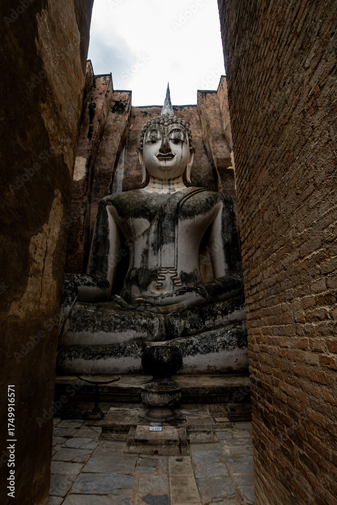 Monumental Buddha image Phra Atchana in subduing mara posture at Wat Sri Chum temple Sukhothai Historical Park, ancient stuccoed brick sculpture, thailand cultural heritage landmark