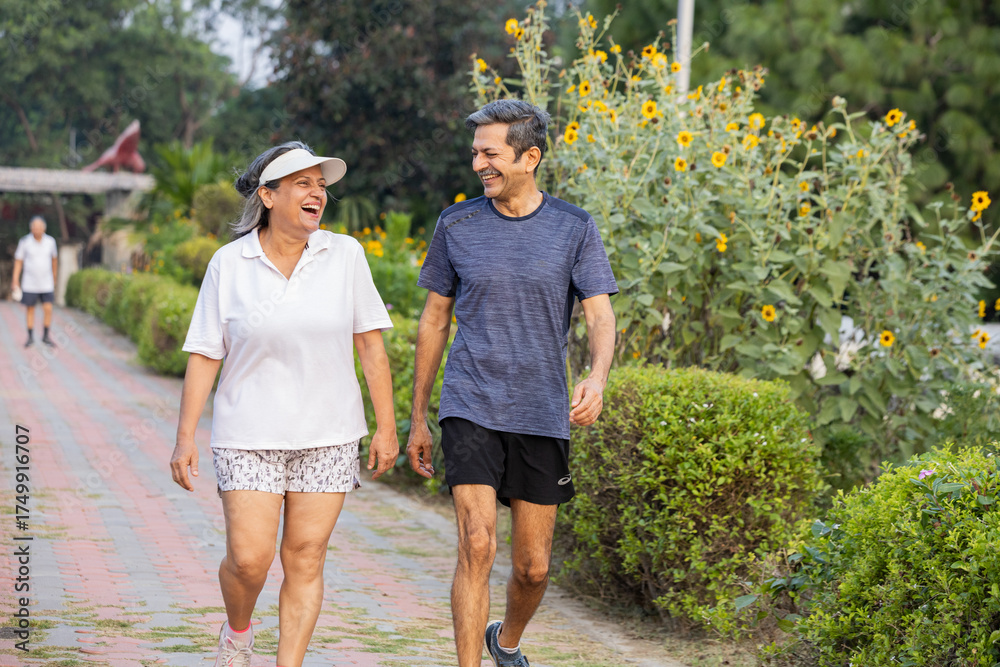 Active Indian senior couple jogging outdoors staying healthy and happy.