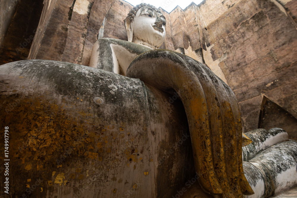 Monumental Buddha image Phra Atchana in subduing mara posture at Wat Sri Chum temple Sukhothai Historical Park, ancient stuccoed brick sculpture, thailand cultural heritage landmark