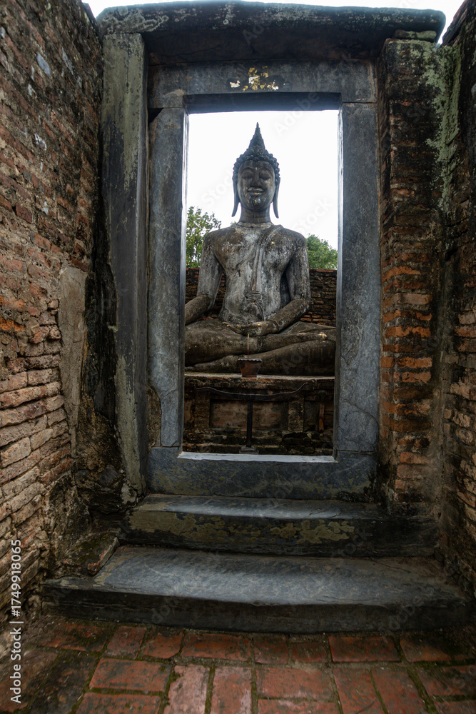 Monumental Buddha image Phra Atchana in subduing mara posture at Wat Sri Chum temple Sukhothai Historical Park, ancient stuccoed brick sculpture, thailand cultural heritage landmark