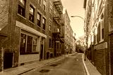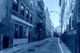 Narrow street lined with traditional brick apartment buildings on a clear autumn day