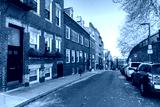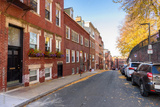 Traditional American brick townhouses and apartment buildings along a street on a clear autumn day
