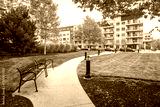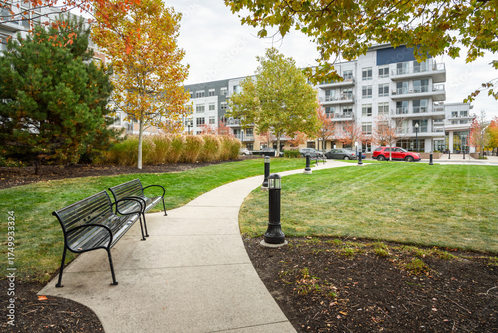 Empty metal benches along a paved path lined with lamps in a park surrounded by modern apartment buildings on a cloudy autumn morning