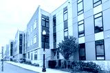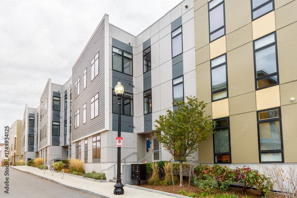 Row of modern apartment buildings along a street on a cloudy autumn day