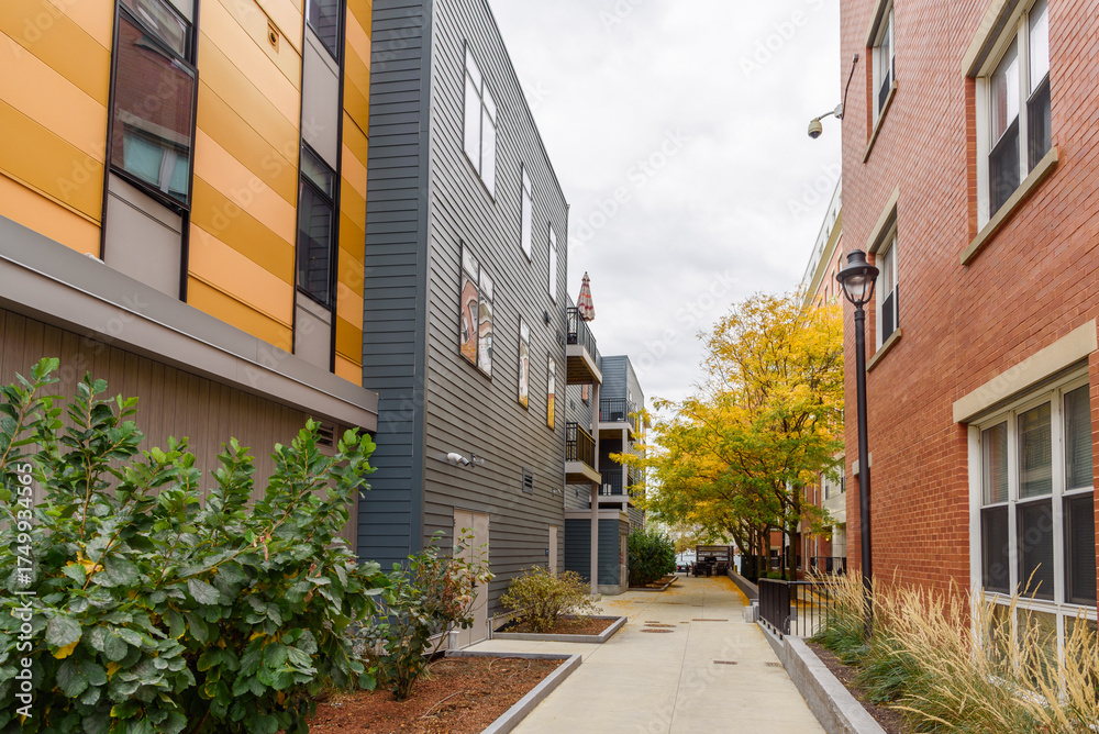 Alley between modern apartment buildings in a waterfront redevelopment in Boston, MA, on a cloudy autumn day