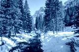 Mountain creek running through a majestic snowy mountain scenery in the Dolomites on a sunny winter day