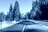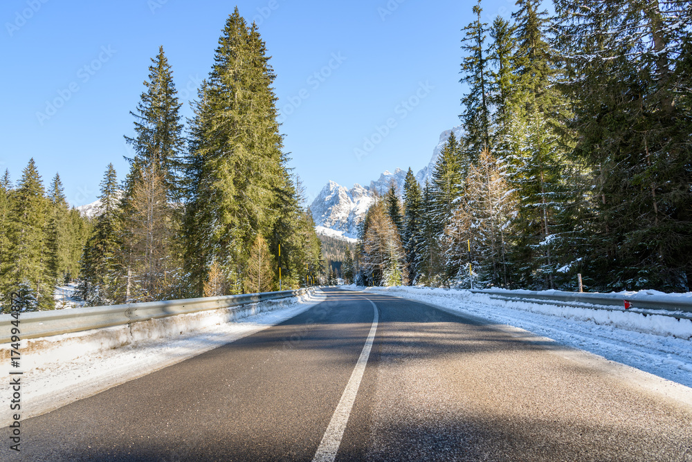 Deserted road through a snowy forested mountain landscape under blue sky on a sunny winter day