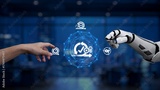 A captivating scene depicting the collaboration between human and robot hands, symbolizing technology transformative role in modern workplaces with intricate digital interfaces. Synapse