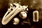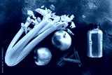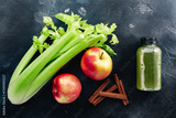 Celery Apple cinnamon fresh pressed juice concept, top view