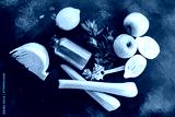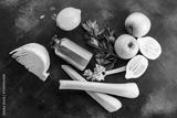 Celery cabbage apple lemon fresh pressed juice concept, top view