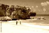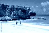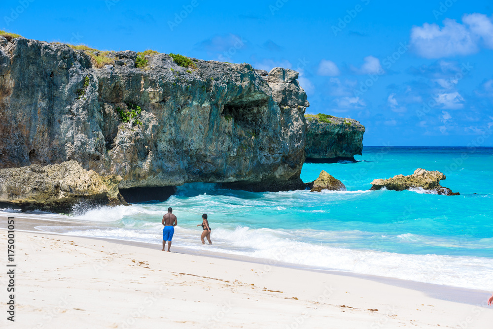 Bottom Bay, Barbados - Paradise beach on the Caribbean island of Barbados. Tropical coast with palms hanging over turquoise sea. Panoramic photo of beautiful landscape.