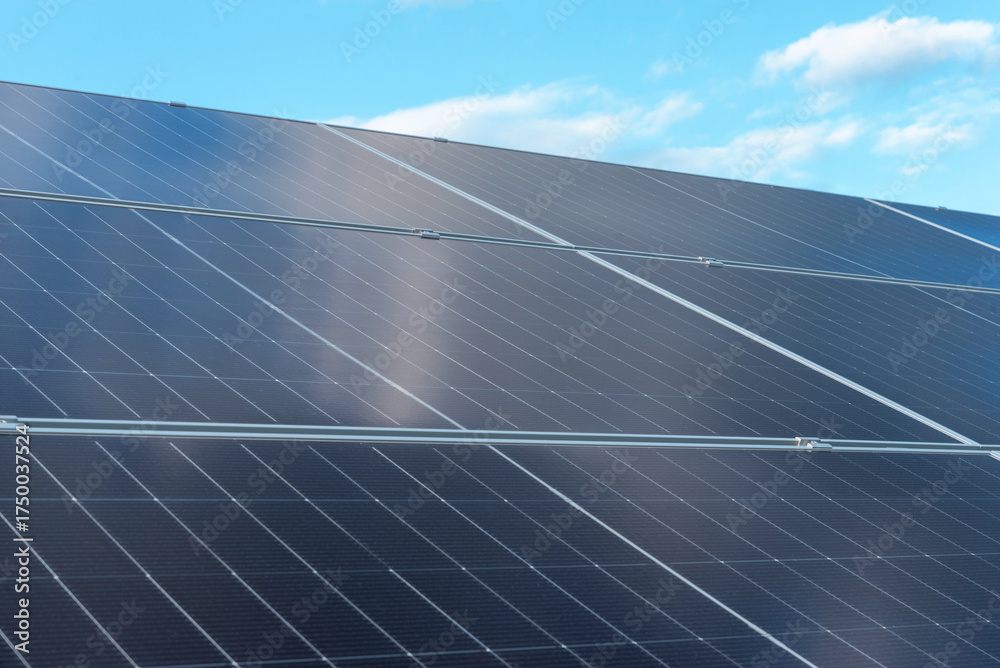 Rows of modern photovoltaic solar panels generating renewable energy under bright daylight sky