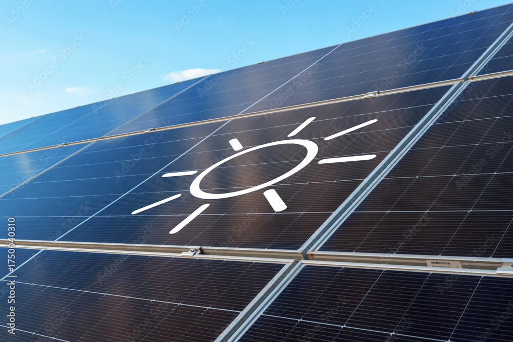 Photovoltaic solar panels with white sun symbol illustrating clean renewable energy concept under blue sky