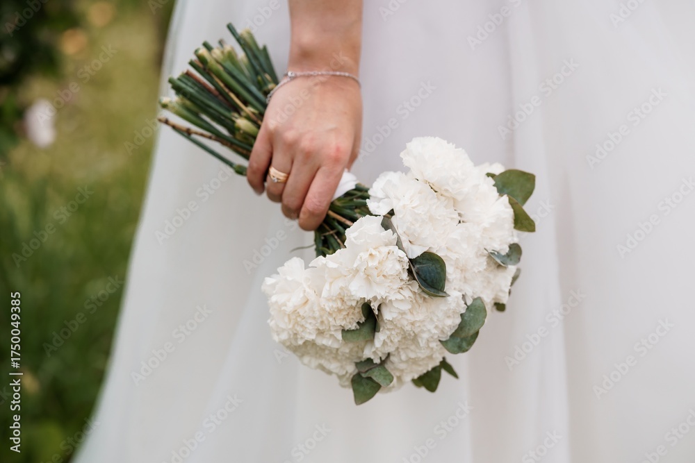 Elegant White Carnaion Wedding Bouquet Held by Bride in Flowing Gown. Soft Focus, Natural Light