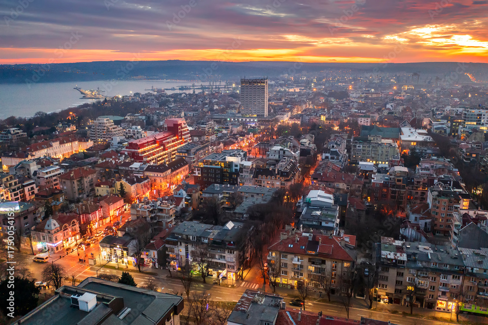 Stunning aerial view of Varna city and seashore at colorful sunset