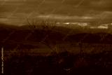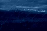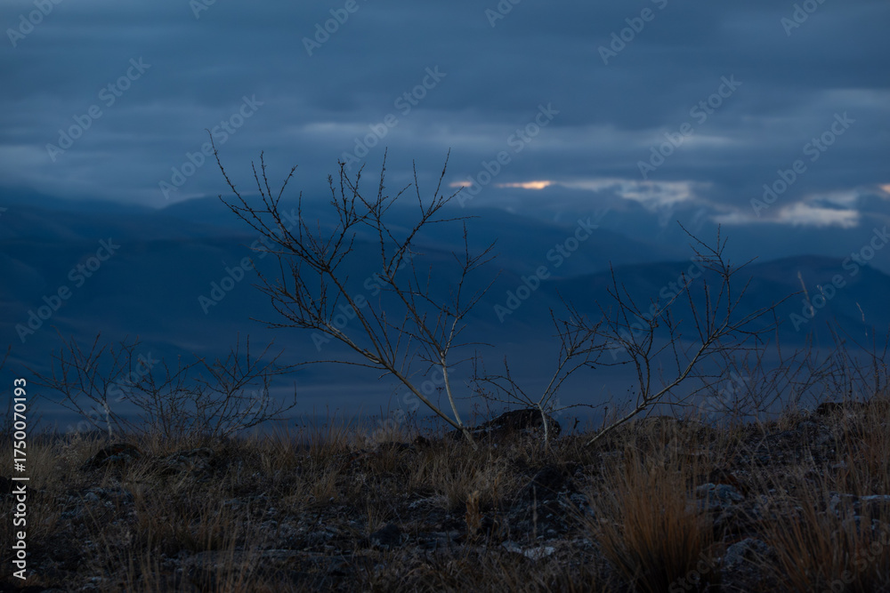 Desert landscape at dusk leafless tree silhouettes against blue sky and distant mountains