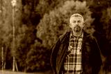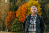 Man standing outdoors in autumn, wearing a plaid shirt and denim jacket, with colorful orange and yellow trees in the blurred background.