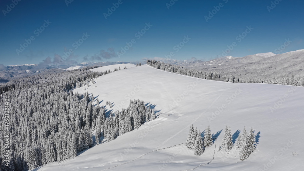 Capturing a breathtaking aerial view of snow-covered mountains and pine forests, revealing a serene winter landscape under a clear blue sky. Bukovel ski resort. Winter wild nature travel background