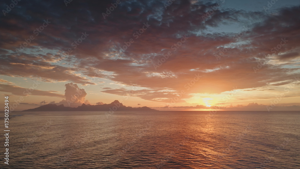 Golden colorful sunset creating warm glow over the tranquil ocean waters, with the silhouette of Moorea tropical island adding to the breathtaking scenery of French Polynesia. Natural background