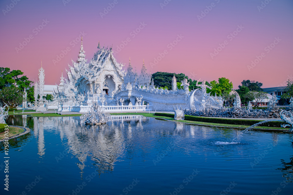 White temple wat rong khun in Chiang Rai, Thailand at sunset