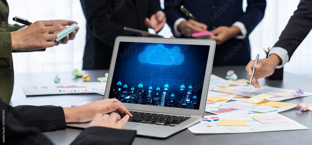 Analyst team use sticky note for creative and analytic brainstorm for business idea with BI data dashboard on laptop screen. Analysis financial data visualization tech for marketing strategy. Prodigy