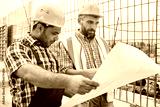 Two men wearing hard hats examining construction blueprint together at building site with exposed steel framework in background