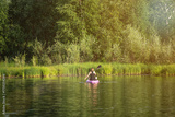 A woman sup surfing paddling on a boat on a river on sunny day: Abakan, Russia - June 08, 2024