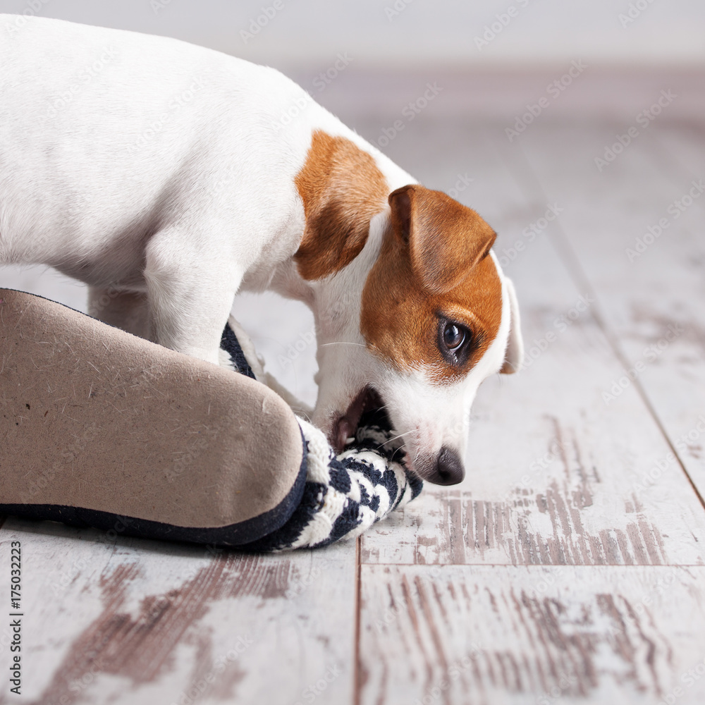 Puppy gnawing at slippers