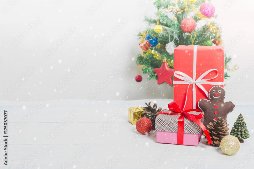 Christmas and New Year holidays gift box with decorative ornament on white wooden table with falling snow effect.Christmas tree background.Gifts and congratulations concept.