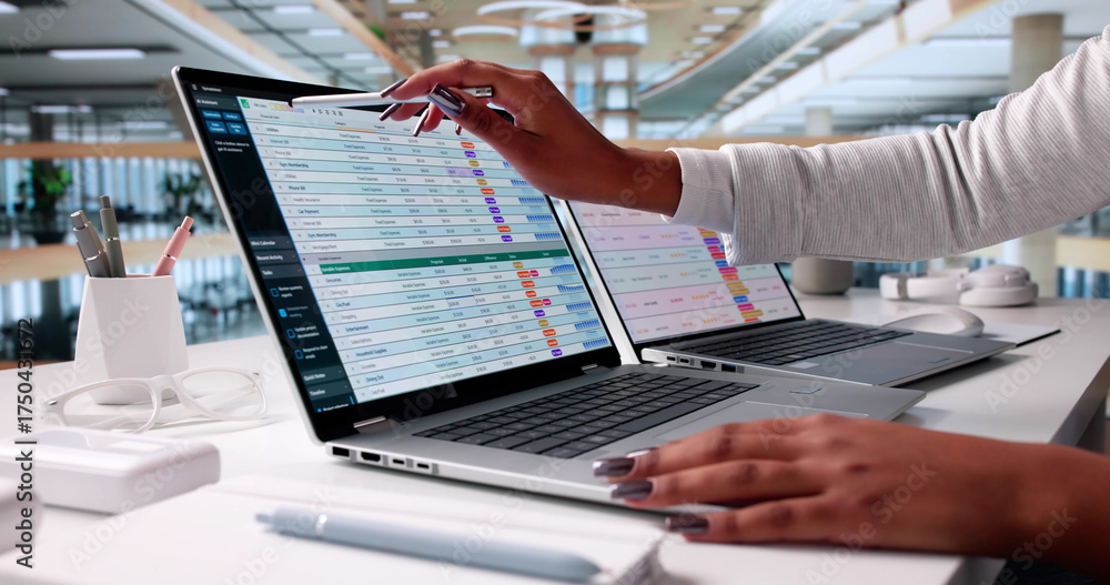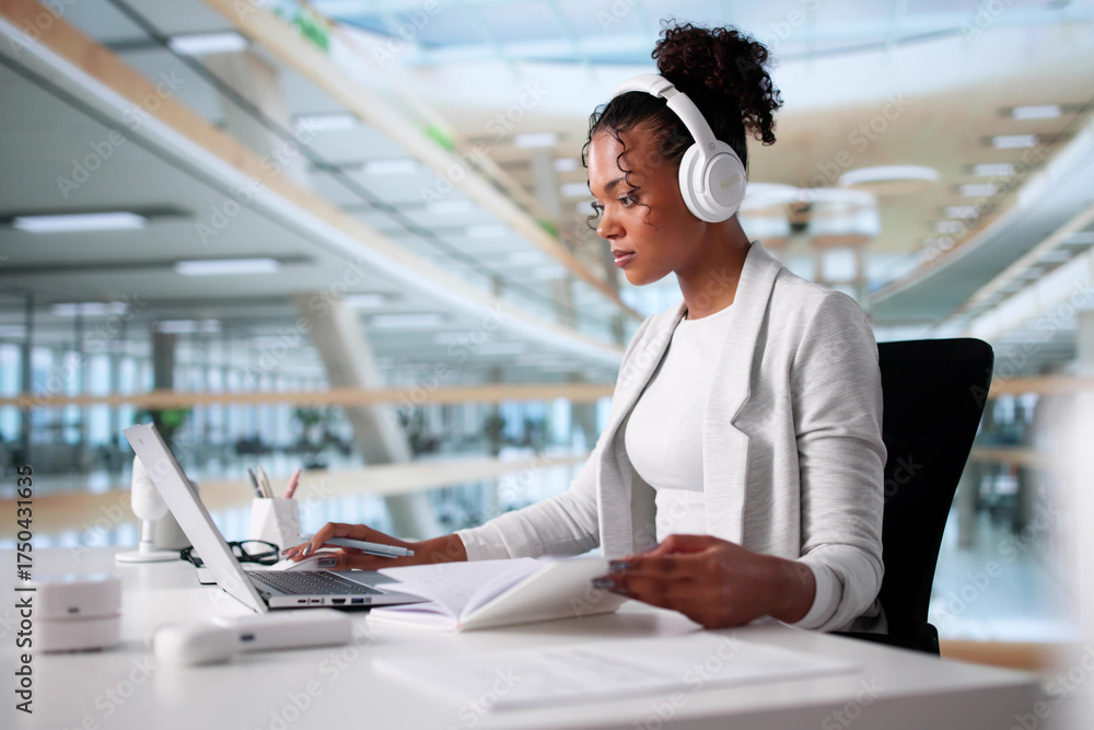 Young Woman At Virtual Webinar, Studying With Black Headphones On