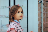 Little Girl in an optical Store Choosing her Eyeglasses Frame. Child spending time in an optometry clinic in order to buy a pair of glasses
