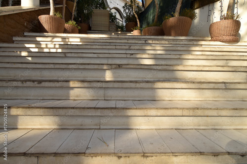 Modern Staircase with Sunlight and Shadows. Contemporary steps illuminated by sunlight with beautiful geometric shadows and warm tones.