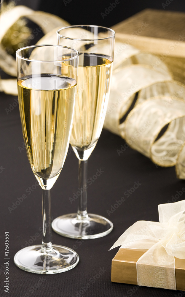 Two champagne flutes, elegant gold gift box with white ribbon.