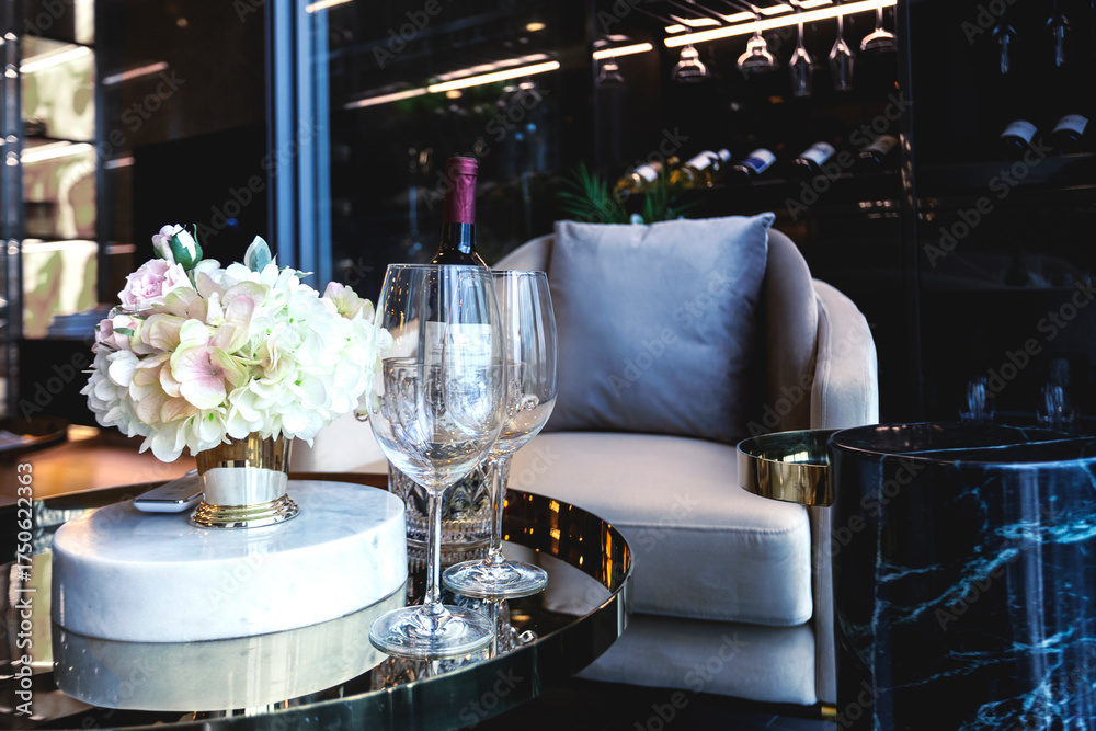 Elegant interior detail with a bottle of red wine, two empty wine glasses, and a bouquet of hydrangeas on a luxurious marble and brass table. The setting suggests a sophisticated evening