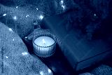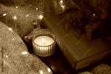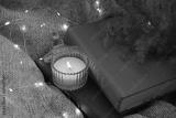 Lit candle in glass holder beside closed book surrounded by soft knitted blanket dried plants and glowing fairy lights creating cozy mood.