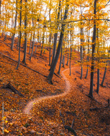 Autumn Forest Trail with Golden Leaves and Warm Light