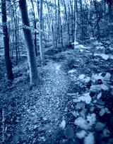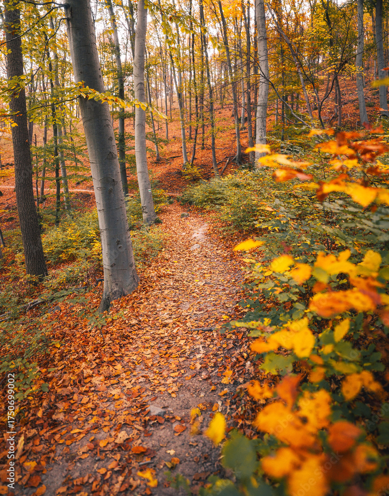 Autumn Forest Trail with Golden Leaves and Warm Light