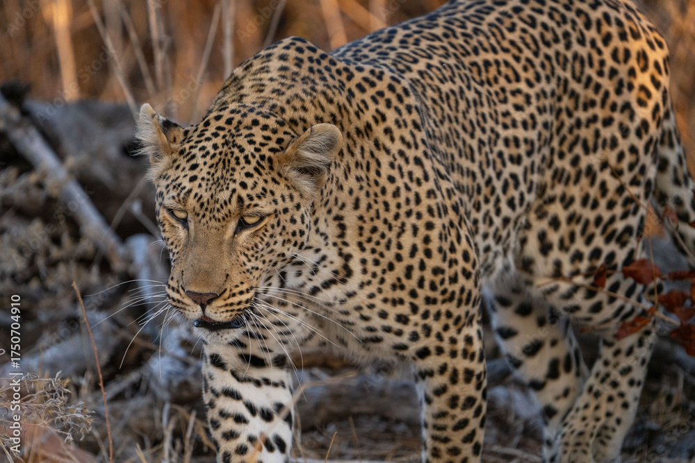 Closeup of an African leopard walking through the thicket in golden light, Greater Kruger.