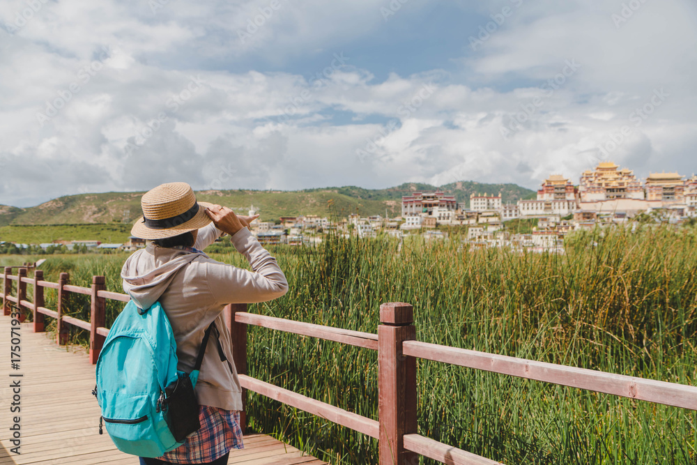 Female tourists are traveling in Little Potala Palace Lamasery.The famous temple in shangri-la , yunnan , china