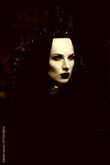 Dark queen in black fantasy costume on dark gothic background