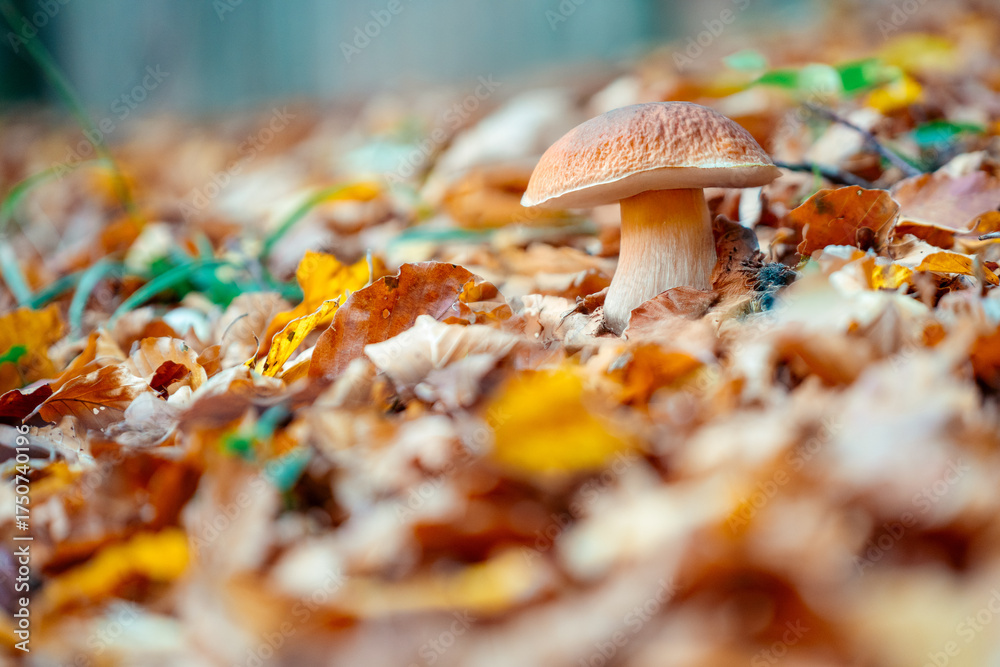 Mushroom growing in autumn leaves