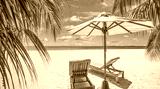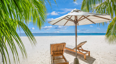 Happy couple love beach landscape two chairs umbrella palm leaves sunny sea view relax summer holiday honeymoon travel together tropical island paradise ocean horizon blue sky vacation leisure romance